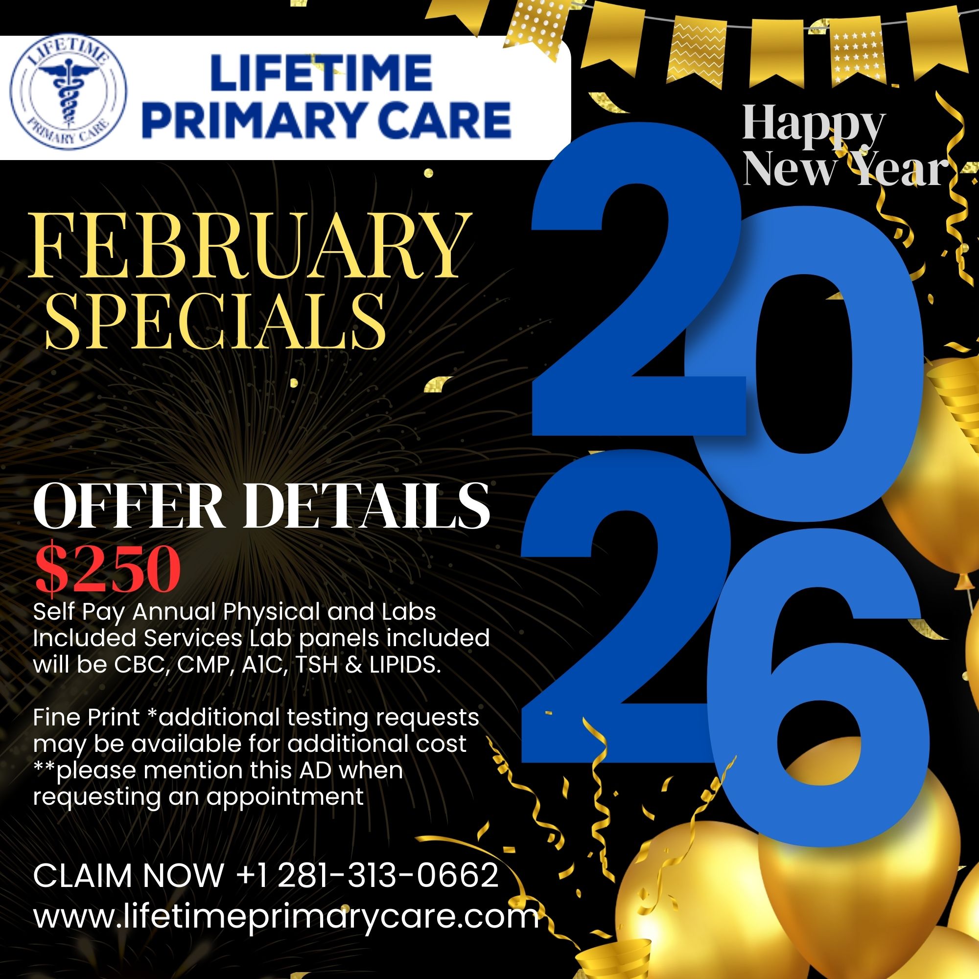 Our February Special includes a comprehensive annual physical plus essential lab panels designed to help you understand your health clearly and catch concerns early.